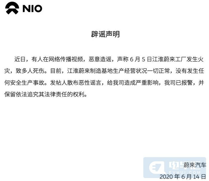 6月14日,蔚来发布辟谣声明,声明表示近日有人在网络传播视频,恶意造谣,声称6月5日江淮蔚来工厂发生火灾致多人死伤。目前,江淮蔚来制造基地生产经营状况一切正常,没有发生任何安全生产事故。